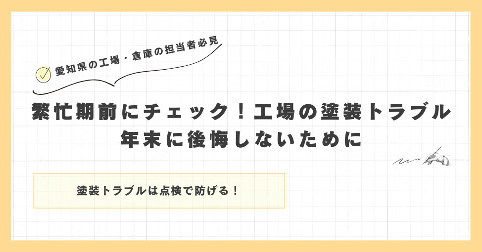 特に愛知県は自動車・金属・食品など多様な製造業が集まる地域。 その分、排気ガス・粉塵・高湿度など、塗装劣化を早める要因も多い環境です。 この記事では、**愛知の工場塗装で起こりやすいトラブルの実例と、繁忙期前に確認しておくべき専門的なチェックポイント**を詳しく解説します!
