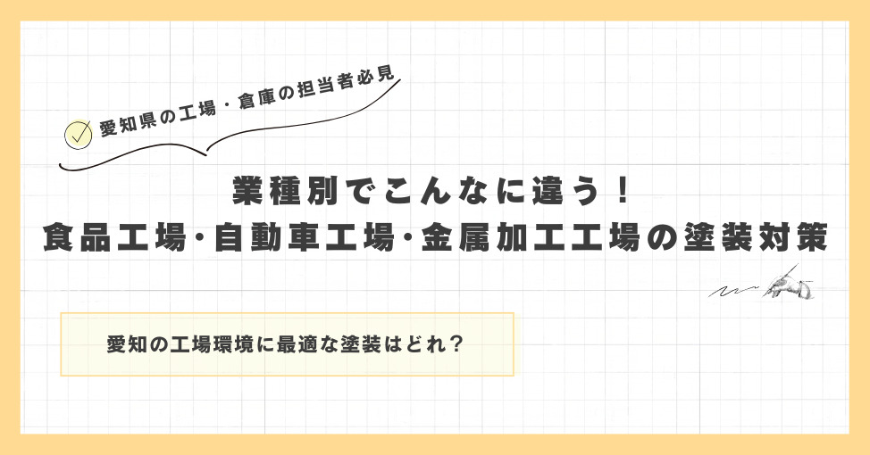 この記事では、愛知に多い食品工場・自動車工場・金属加工工場に向けた工場塗装について、劣化原因に合わせた最適な対策を解説します。この記事を読むと、自社に最適な工場塗装が分かり、無駄な塗装費を防げます。 工場塗装・外壁塗装を検討中の方は、ぜひ最後まで読んでみてください!