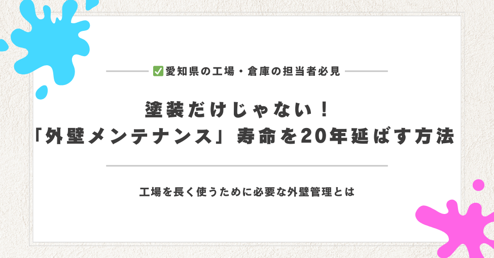 この記事では、愛知県で工場塗装・外壁塗装を検討している方に向けて、工場の寿命を20年延ばす外壁メンテナンスの考え方と、工場塗装に失敗しないための3つのチェックポイントを分かりやすく解説します。